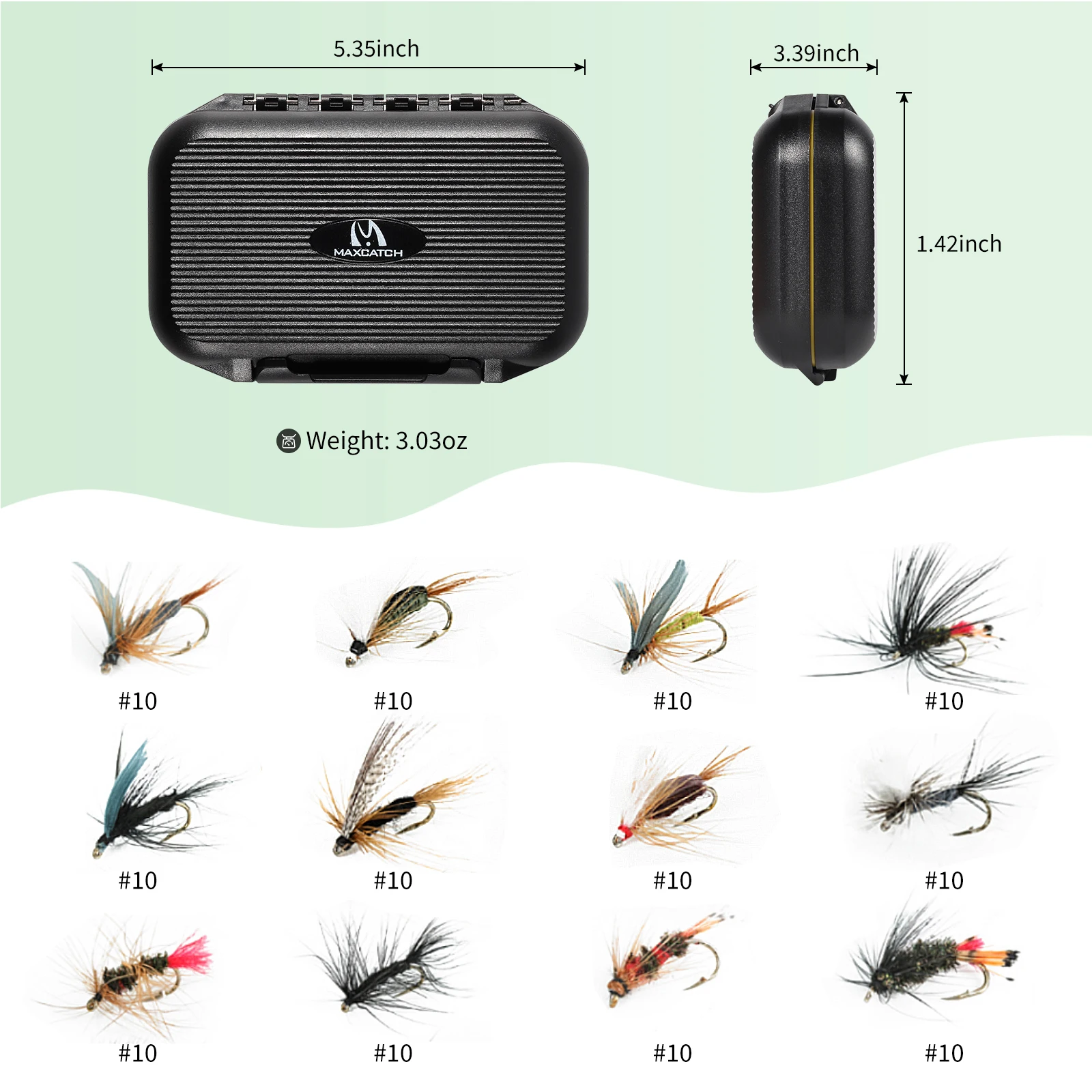 *****FLIES,BOX & ROD BAG– A durable but also convenient travel rod bag with reel pouch to hold everything together. Waterproof, Floating Fly Box-5.24’’X3.54’’1.38’’, holds up to 372 flies. Includes 12 pc hand tied dry and wet flies, hook size:#10. A neoprene reel pouch is included for easy protection of the reel.